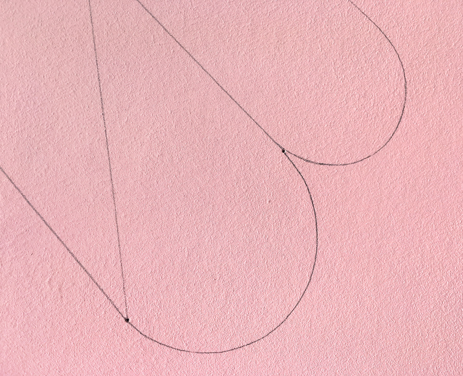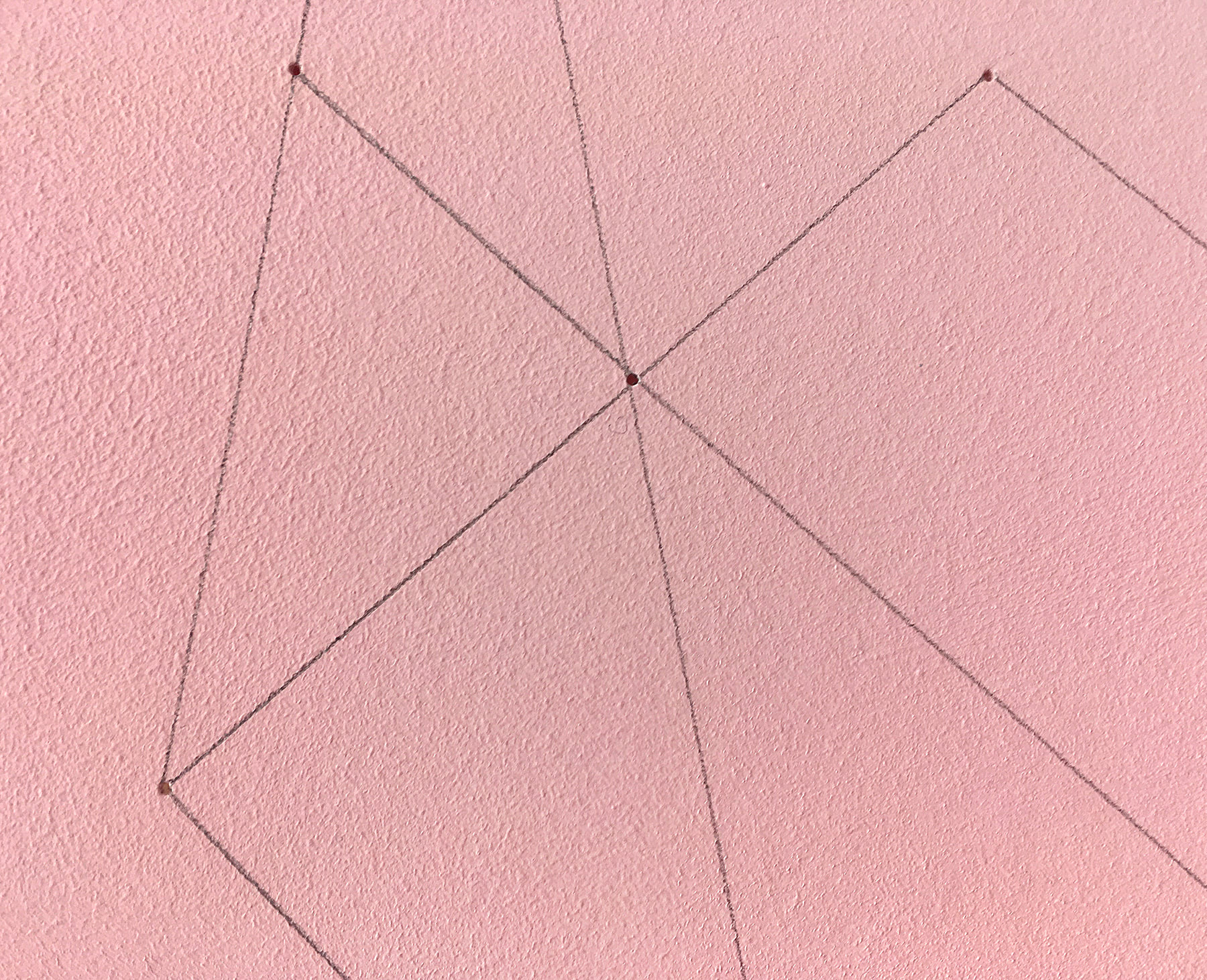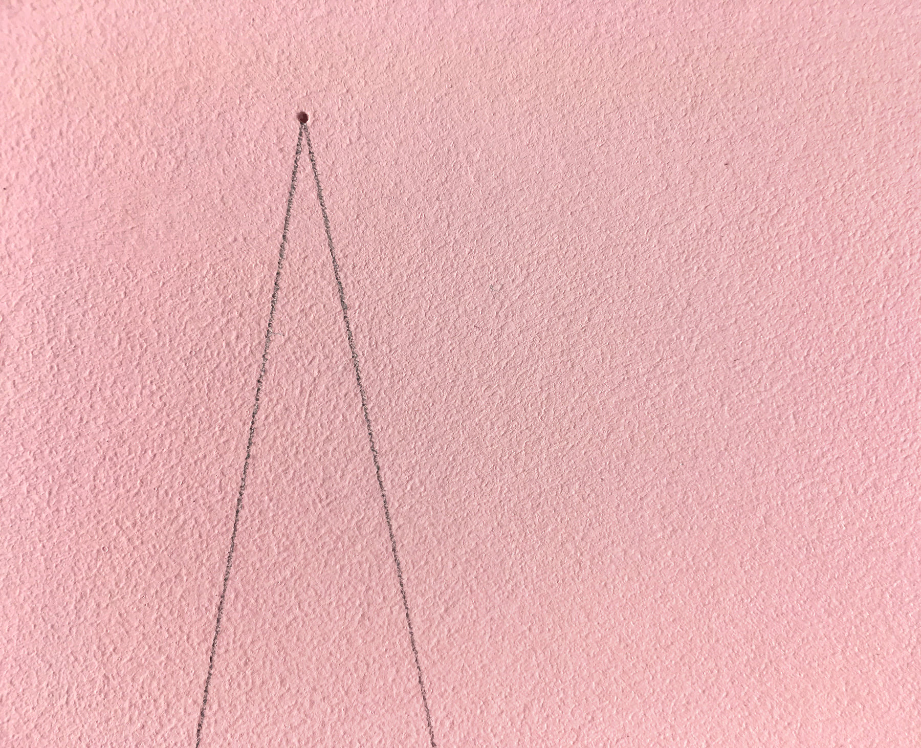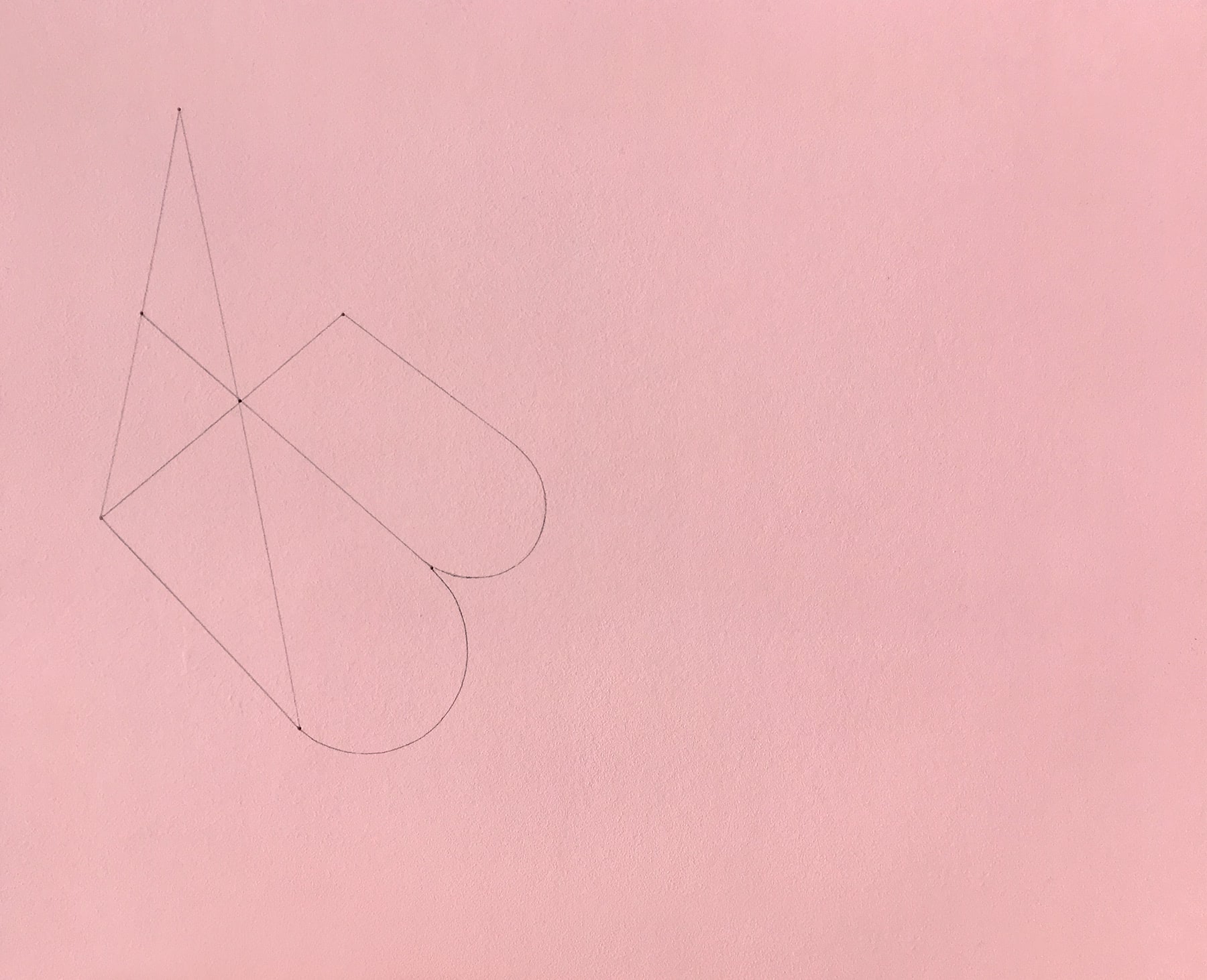À l’origine, [At origin,] by Étienne Pressager is an artwork made in eight unique copies. They are produced with the greatest possible similarity. The letters AB, the initials of the artist's mother, are drawn with a silverpoint. The paper has been perforated at the intersection of the lines, reminding a cosmic constellation. The surface is gesso painted, which is, as the use of the silverpoint, an ancient Renaissance technique. The pink colour can be understood as a metaphor for the human, organic origin, as well as a reference to the 'Roseraie' hospital in Épinal where the artist was born. Roses have thorns, Rrose Sélavy says Duchamp, the letter B is the shadow of the A, and the comma at the end of the title suggests that something can arise.