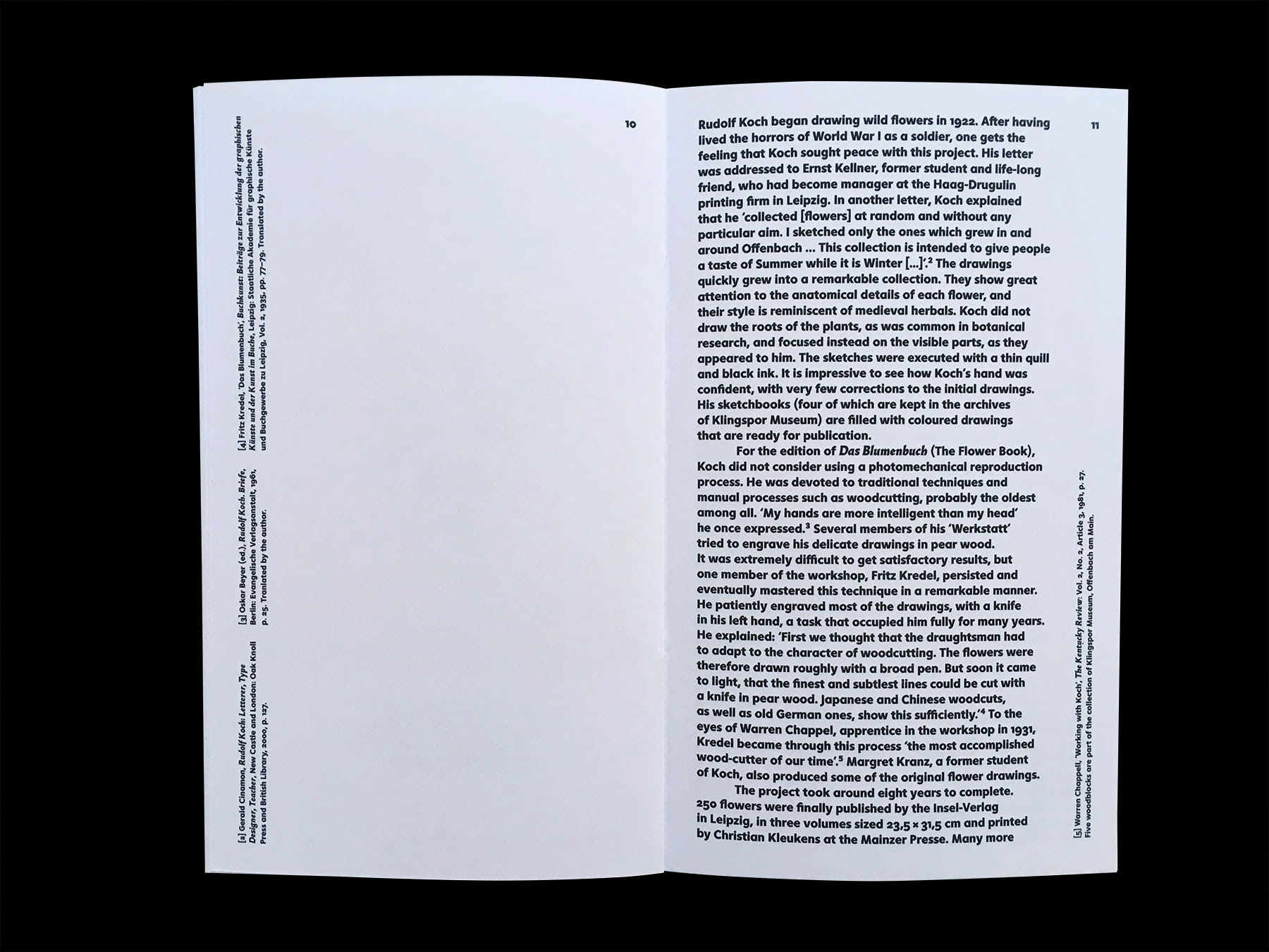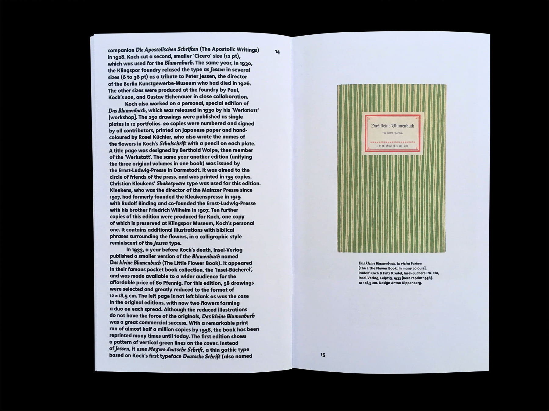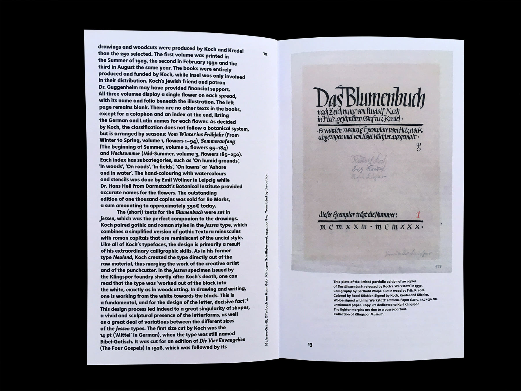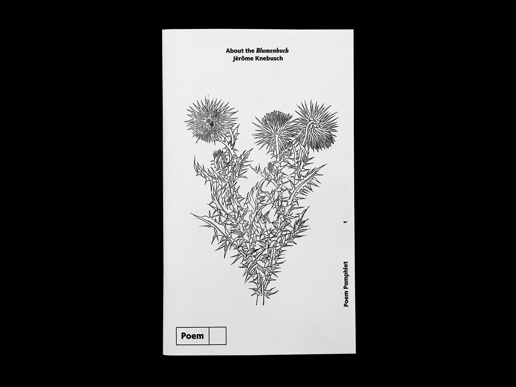 Rudolf Koch's and Fritz Kredel's remarkable Blumenbuch [the flower book] was published several times between 1929 and 1942, from pocket book editions to precious volumes and portfolios, involving many collaborators, printers and publishers like Mainzer Presse, Ernst-Ludwig-Presse in Darmstadt and Insel-Verlag, Leipzig. The essay by Jérôme Knebusch compiles a detailed chronology of the different editions and presents rare and unpublished material from the archives of the Klingspor Museum, Offenbach am Main. About the Blumenbuch is the first of the Poem Pamphlet series edited by Alice Savoie and Jérôme Knebusch.