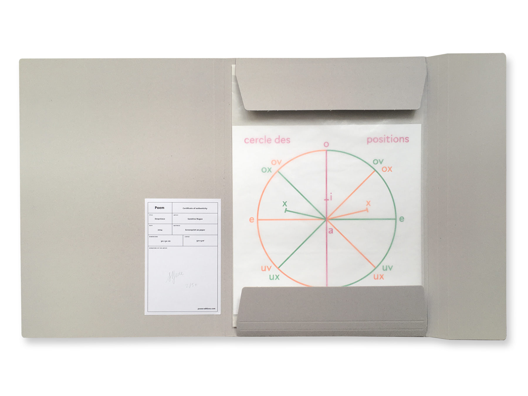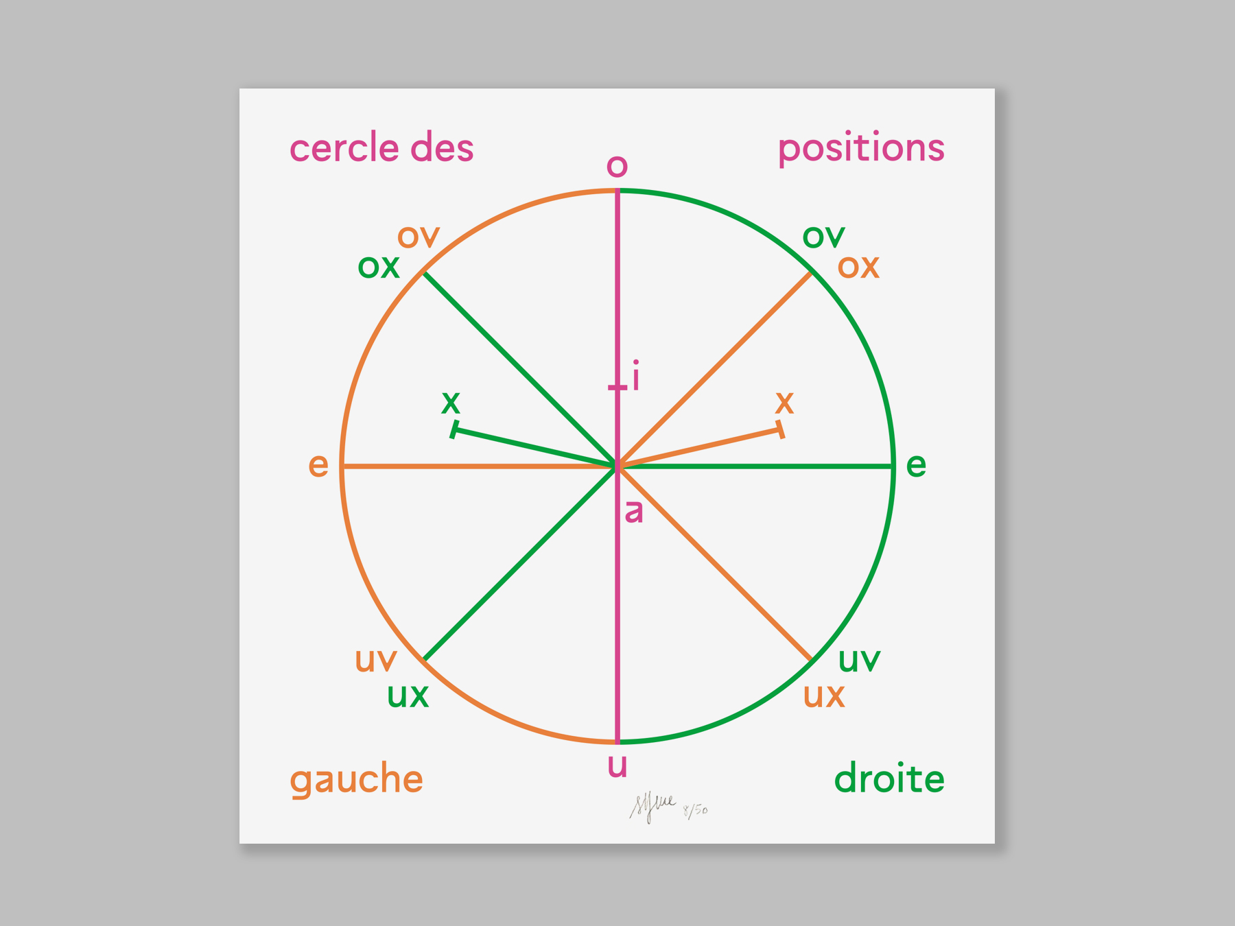 The ‘maître à danser’ Jean-Étienne Despréaux (1748-1820) developed a dance notation based on letters that he animated. During a visit to the library of the Opéra Garnier and based on the research of Pauline Chevalier (INHA Paris), Sandrine Nugue discovered the relatively unknown archives of Despréaux, which combine dance movements with letterforms. She developed her research during a residency at Fotokino in 2023, followed by a performance at the Musée d'art contemporain de Marseille with the dancer Julien Monty. The ‘circle of positions' is an essential element of the system, which employs vowels to indicate the position of the feet.