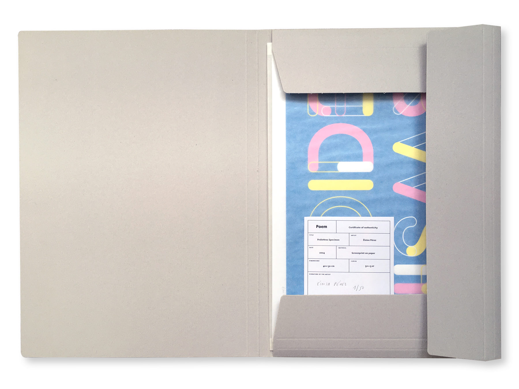 After the publication of Éloïsa Pérez's essay 'The material discovery of the alphabet', the lettering template and the Prélettres typeface (all in 2021), the new edition 'Prélettres Specimen' completes Perez's work at Poem. The so-called specimen is actually a limited screenprint in three colours, signed and numbered by the artist. It displays all 26 letters of the Latin capital alphabet – and everything that can be imagined with the modules.