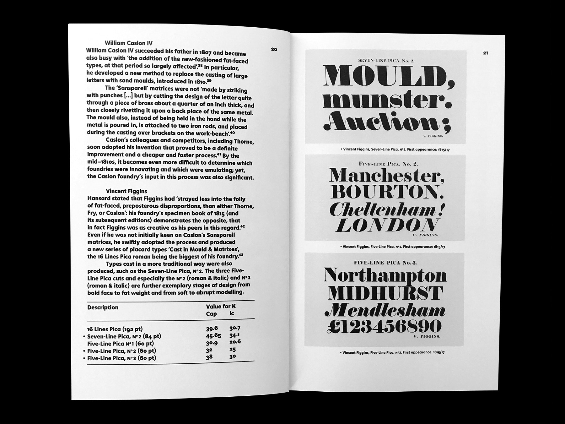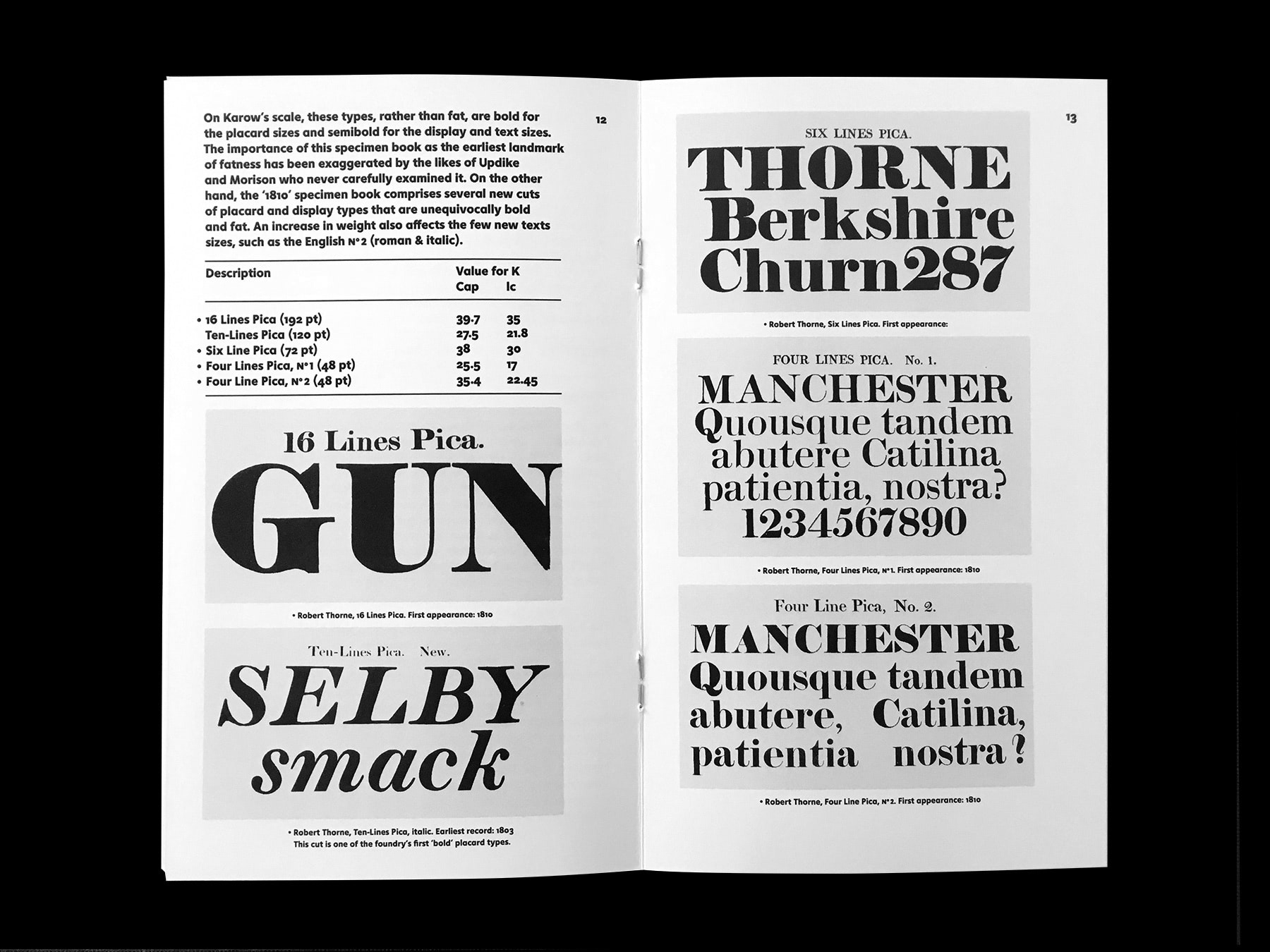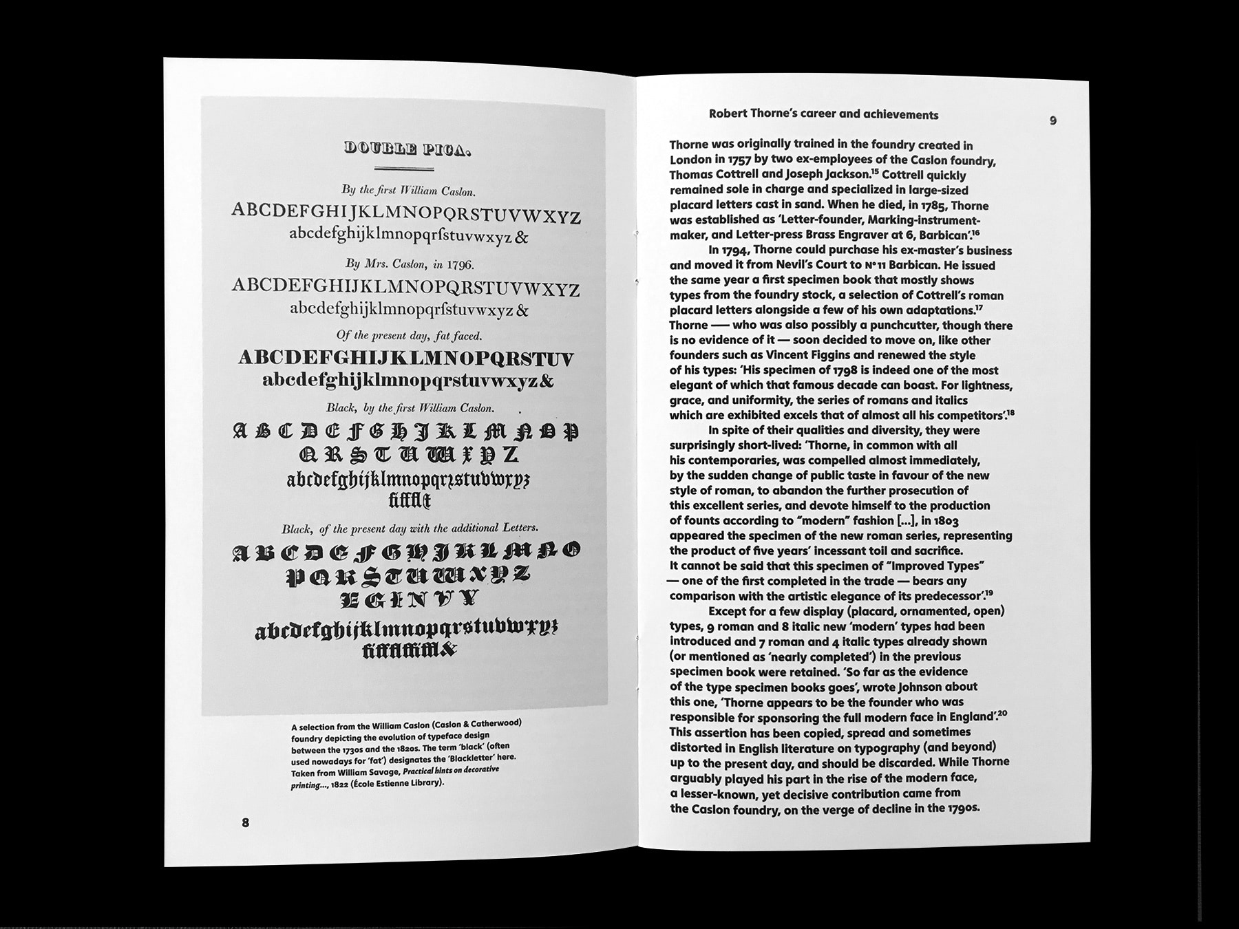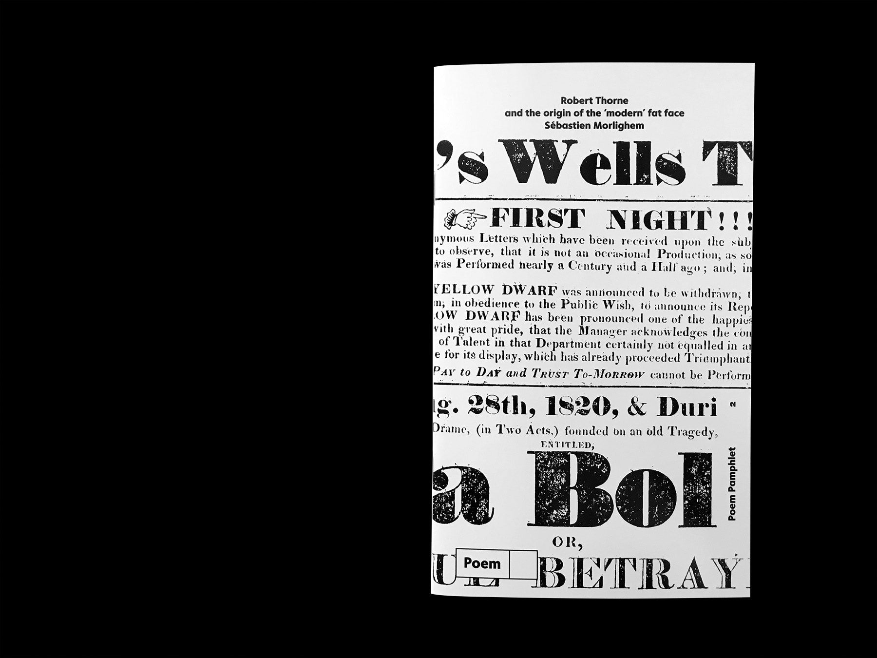 It is usually believed that the typefounder Robert Thorne (1753–1820) was the first to have introduced in the early 19th century the ‘fat face’, a swollen offspring of the new ‘modern’ types then in vogue. Sébastien Morlighem’s essay intends to reassess his precise role in its development as well as other English founders. It is built on a re-reading of several key texts and a careful survey of original specimen books from the Thorne, Caslon & Catherwood, Fry & Steele and Figgins foundries. Edited by Alice Savoie and Jérôme Knebusch in the Poem Pamphlet series.