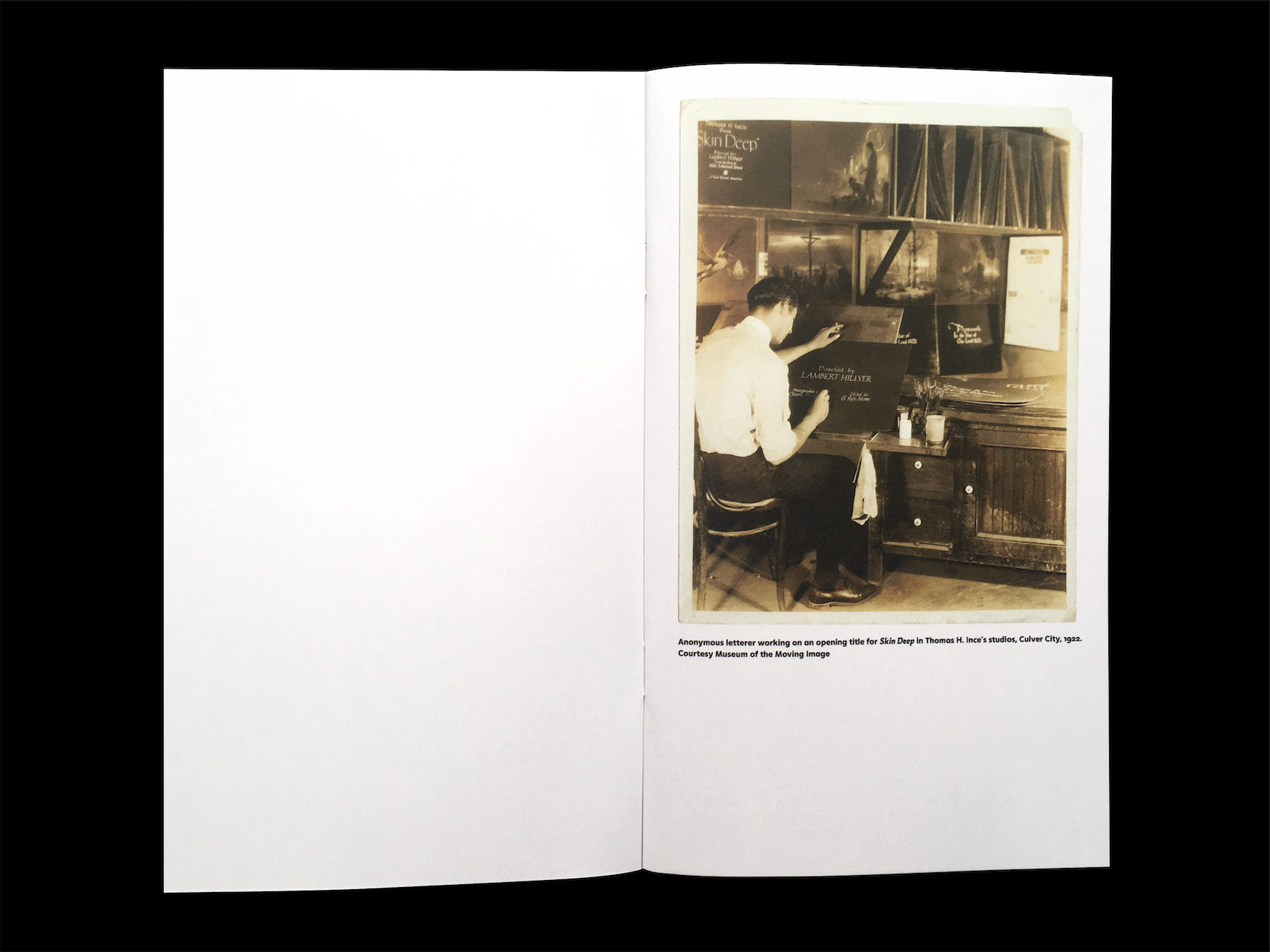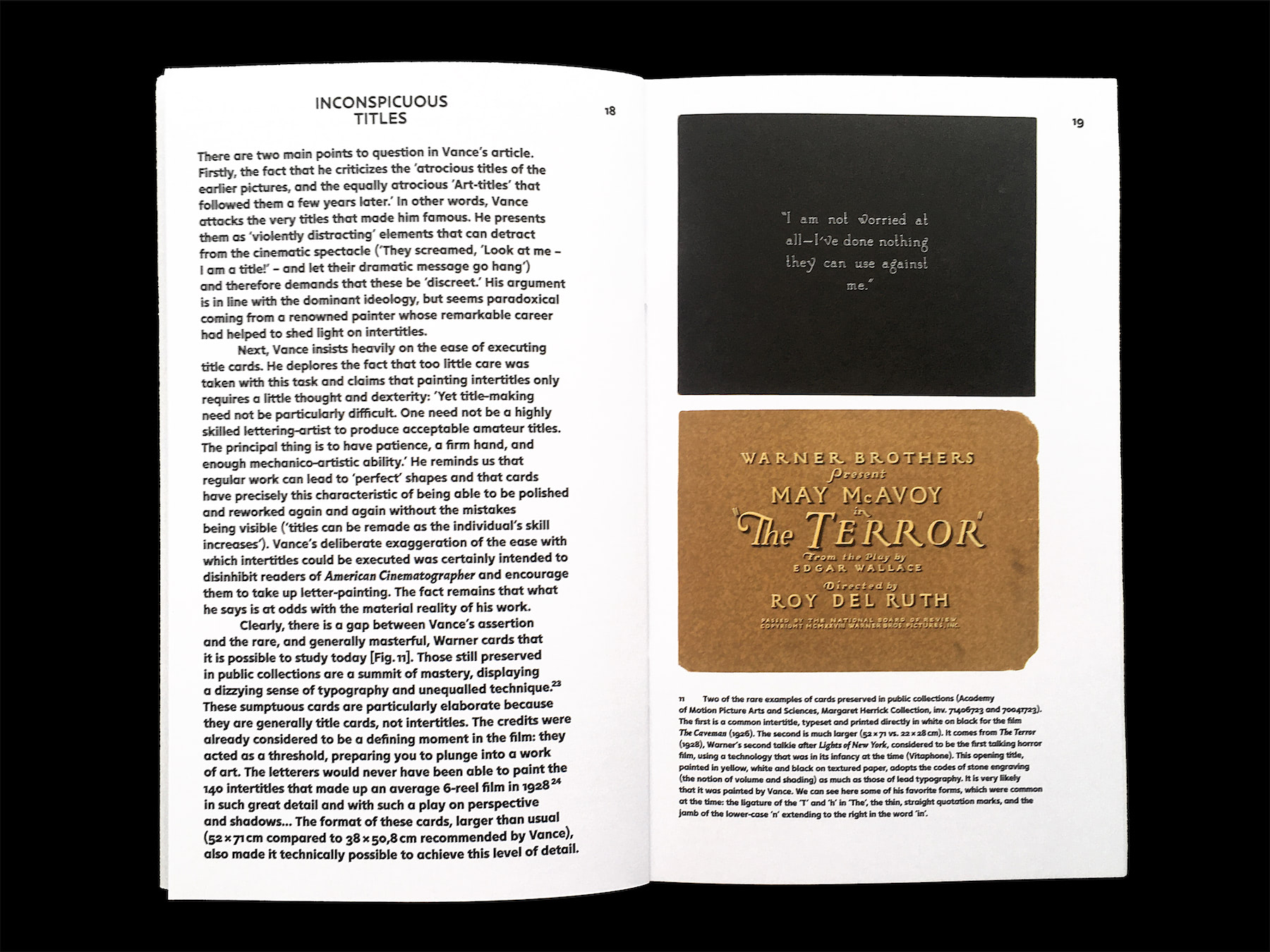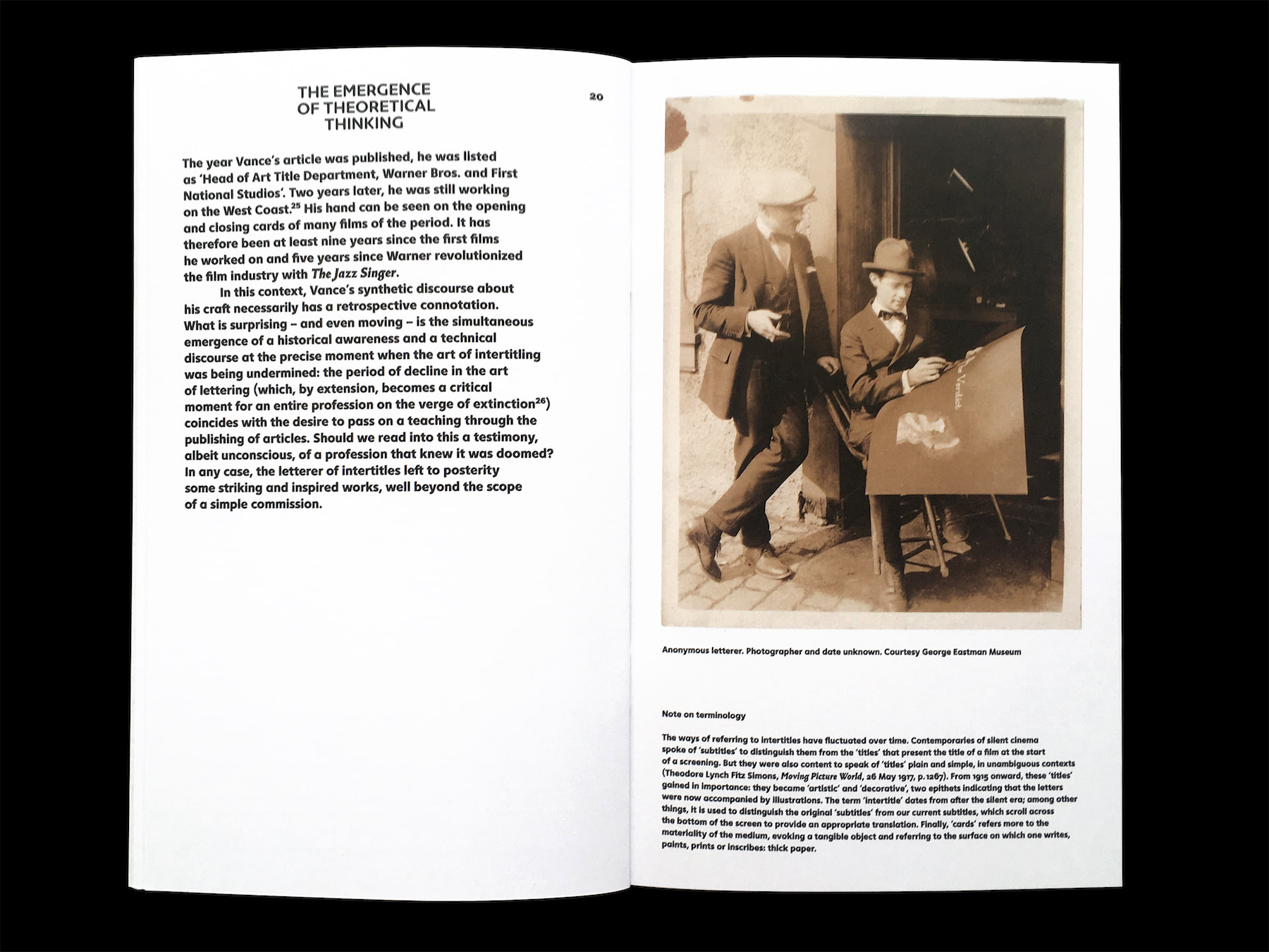 Until the advent of talking pictures, cinema had been referred to as silent. To compensate for the absence of sound, films were punctuated by numerous ‘intertitles’ containing a fixed text, interspersed among the sequences of moving images. Intertitles could be hand-painted on thick paper or glass plates, using brushes or round-tipped nibs, by teams of letterers capable of producing up to 100 cards a day. Yet today we know almost nothing about these technically gifted craftsmen. However, at the end of the 1910s, in the United States, the name of a technician occasionally appeared in the film credits: that of Victor Vance, a letterer associated with the Warner Bros. studio. His distinctive style of lettering, constant over the years, was based on a virtuosic use of the brush. Considered a ‘title-artist’, he also wrote in 1930 an article on how to paint intertitles. This account sheds valuable and precise light on the methods used to produce intertitles and the way these objects were viewed at the time. Written by Julien Van Anholt and edited by Alice Savoie and Jérôme Knebusch in the Poem Pamphlet series.