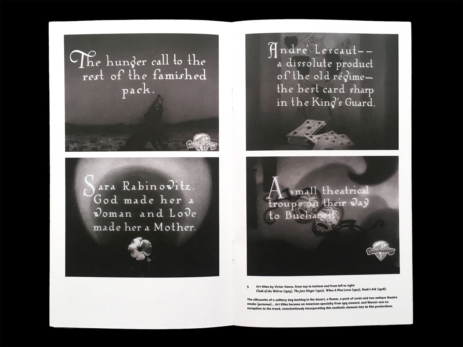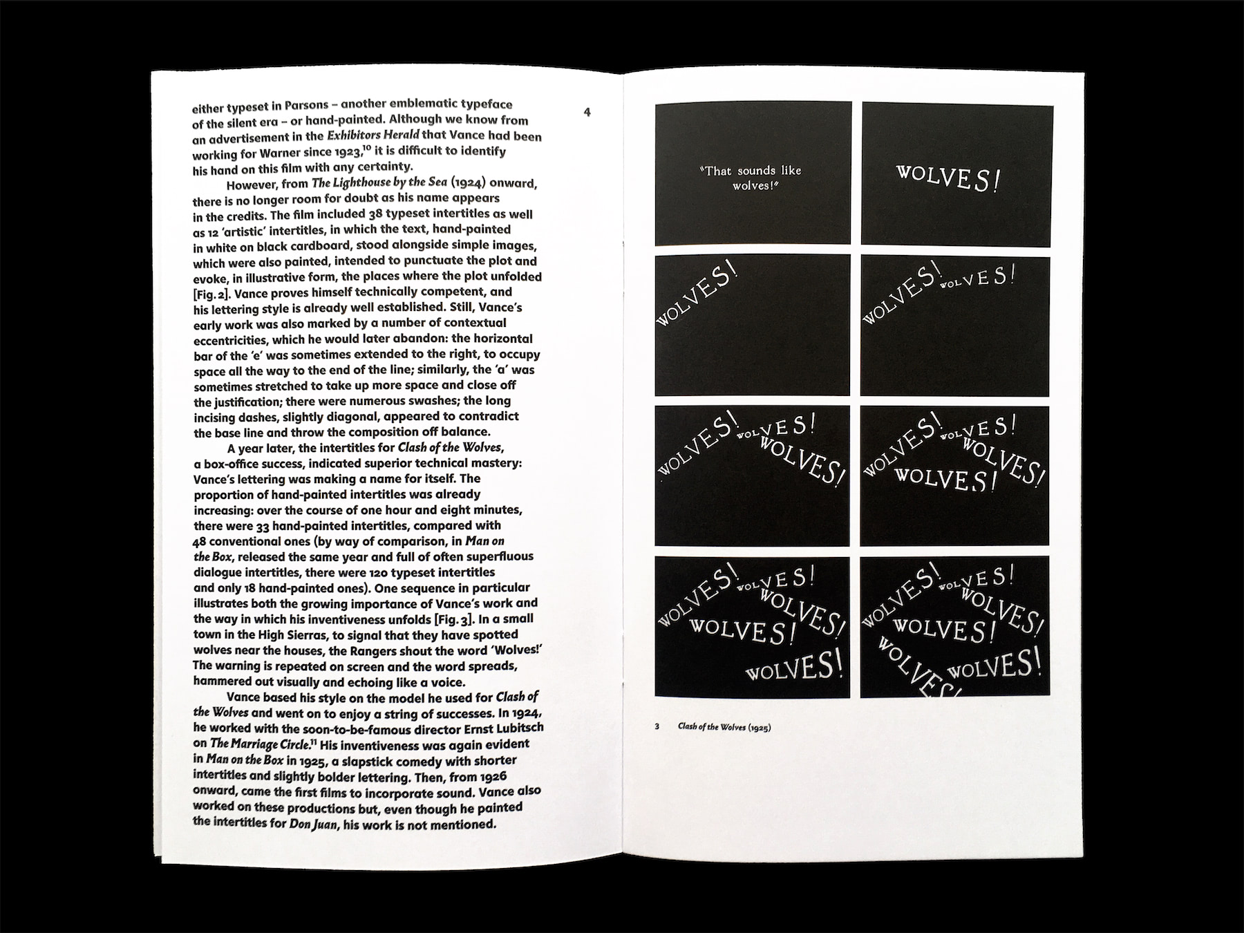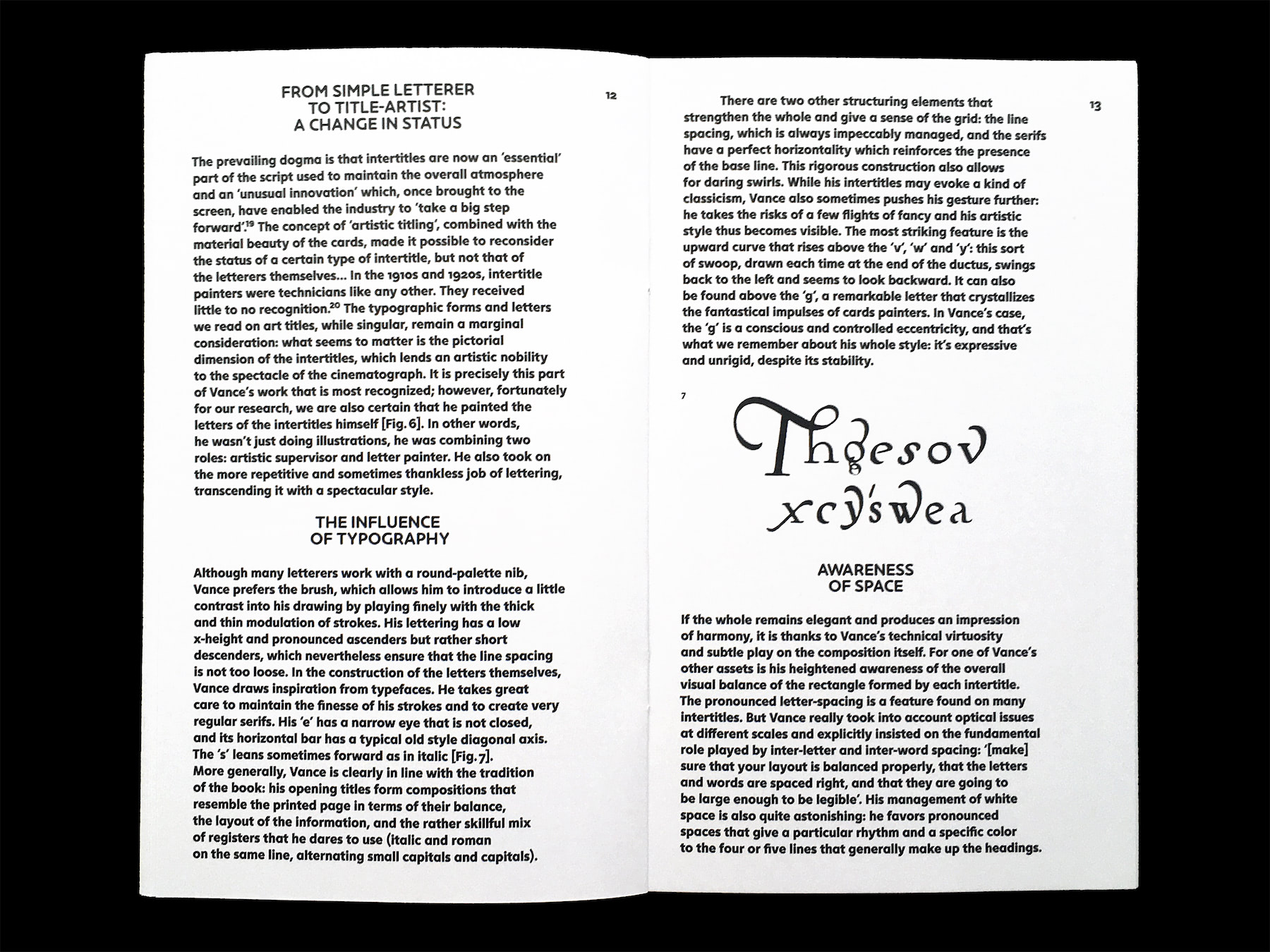 Until the advent of talking pictures, cinema had been referred to as silent. To compensate for the absence of sound, films were punctuated by numerous ‘intertitles’ containing a fixed text, interspersed among the sequences of moving images. Intertitles could be hand-painted on thick paper or glass plates, using brushes or round-tipped nibs, by teams of letterers capable of producing up to 100 cards a day. Yet today we know almost nothing about these technically gifted craftsmen. However, at the end of the 1910s, in the United States, the name of a technician occasionally appeared in the film credits: that of Victor Vance, a letterer associated with the Warner Bros. studio. His distinctive style of lettering, constant over the years, was based on a virtuosic use of the brush. Considered a ‘title-artist’, he also wrote in 1930 an article on how to paint intertitles. This account sheds valuable and precise light on the methods used to produce intertitles and the way these objects were viewed at the time. Written by Julien Van Anholt and edited by Alice Savoie and Jérôme Knebusch in the Poem Pamphlet series.