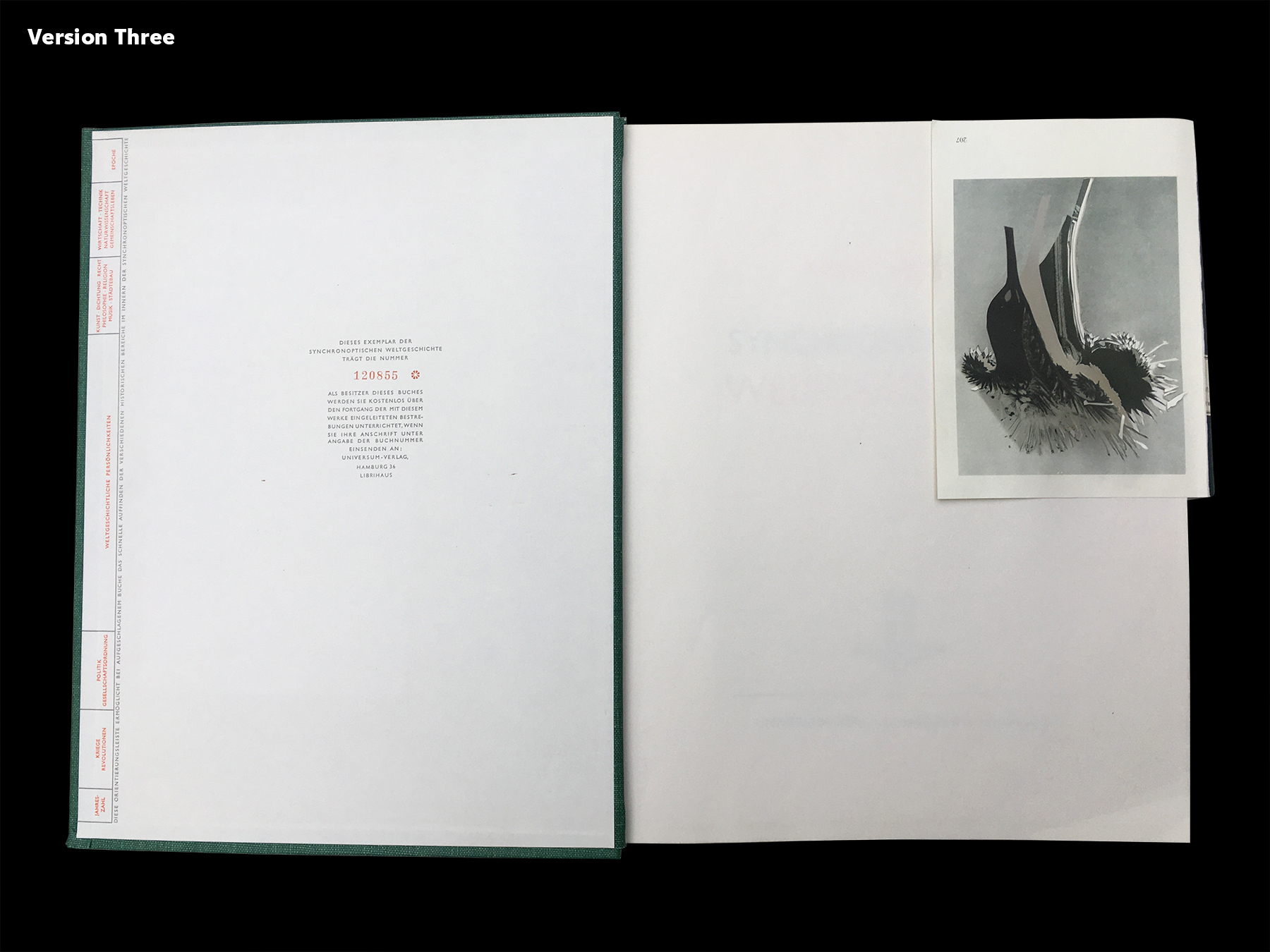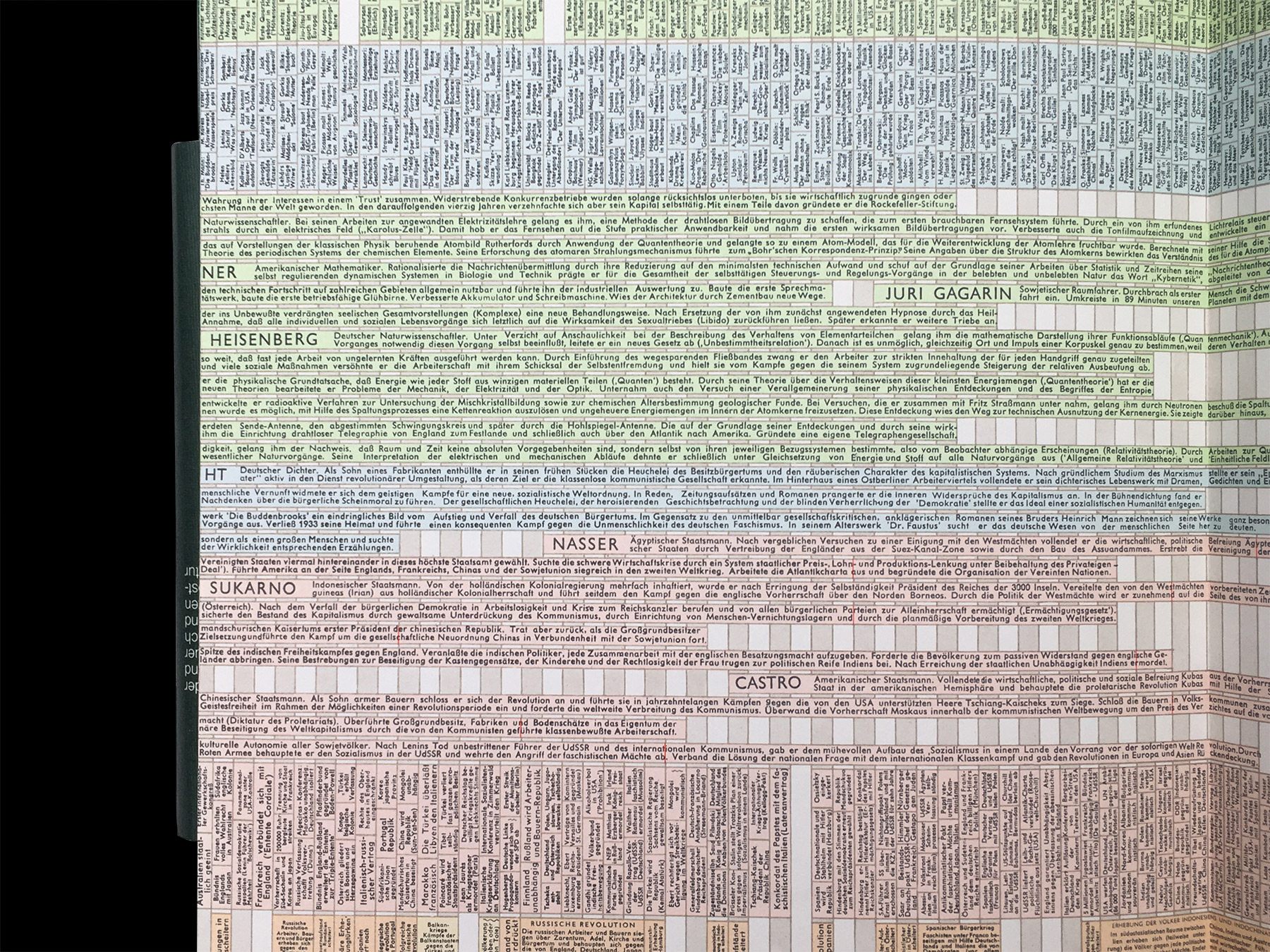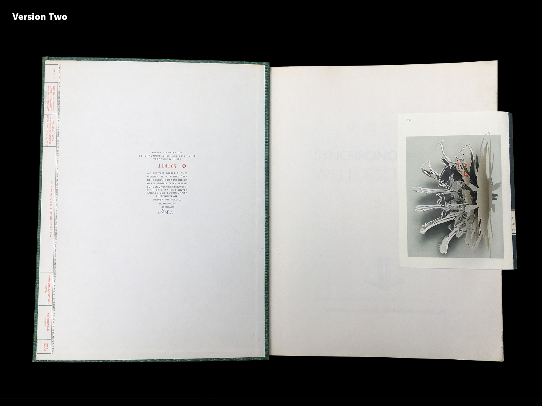 Synchronoptische Weltgeschichte [Synchronoptic World History] by Arno and Anneliese Peters is a visual presentation through a socialist perspective of the history of civilization from 1000 BC until today. It was first published in 1952 by Universum-Verlag, Frankfurt am Main. The edition Nygård has used is from 1965. Urformen der Kunst [Art Forms in Nature] by Karl Blossfeldt is a founding work of the Neue Sachlichkeit aesthetic. Rigorous, formal photographs of plants were initially produced as teaching material for Blossfeldt's courses in Berlin, they were projected and had to be copied with a sharp 'ligne claire' drawing. The book Urformen der Kunst was published in 1928 by Ernst Wasmuth Verlag in Berlin. A year later, the book was published in New York. Blossfeldt became famous overnight and his work had great influence on the modern art movement. For Zeitlinie, Nygård has used a pocket book edition of 1982.