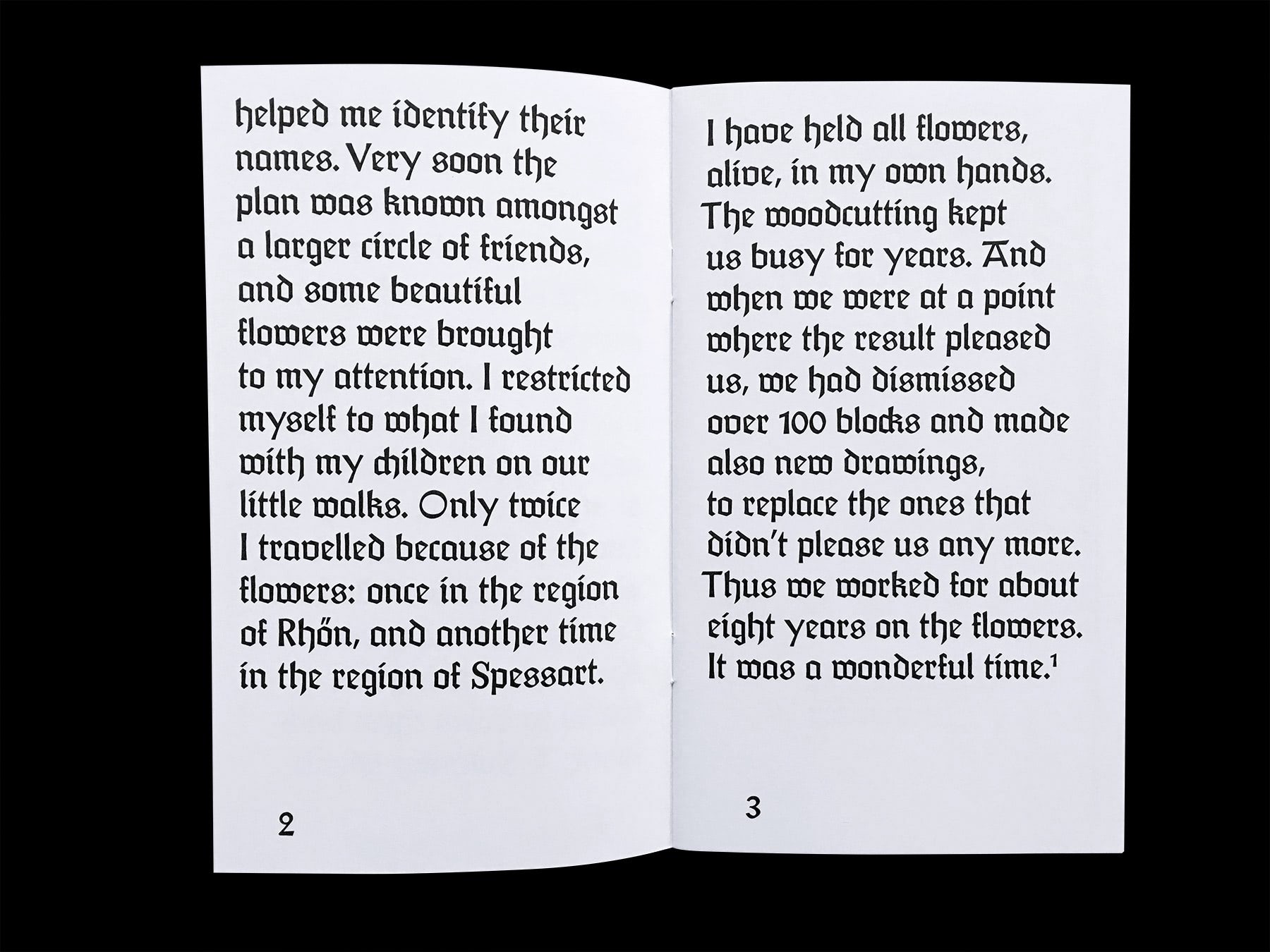 Rudolf Koch's and Fritz Kredel's remarkable Blumenbuch [the flower book] was published several times between 1929 and 1942, from pocket book editions to precious volumes and portfolios, involving many collaborators, printers and publishers like Mainzer Presse, Ernst-Ludwig-Presse in Darmstadt and Insel-Verlag, Leipzig. The essay by Jérôme Knebusch compiles a detailed chronology of the different editions and presents rare and unpublished material from the archives of the Klingspor Museum, Offenbach am Main. About the Blumenbuch is the first of the Poem Pamphlet series edited by Alice Savoie and Jérôme Knebusch.